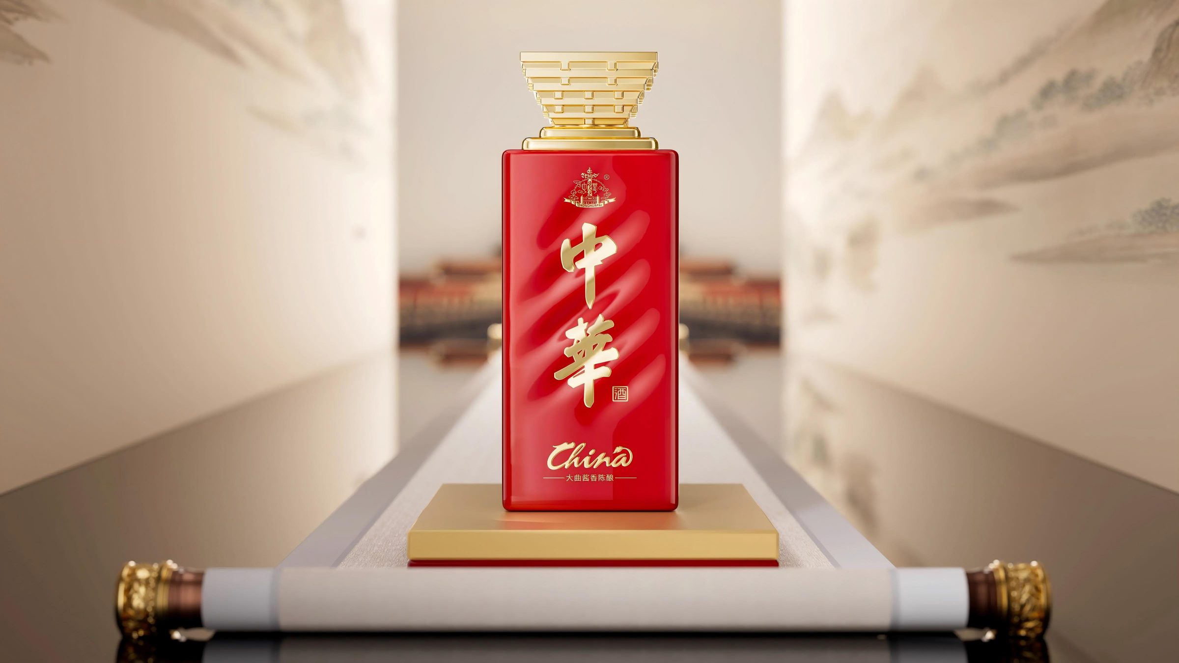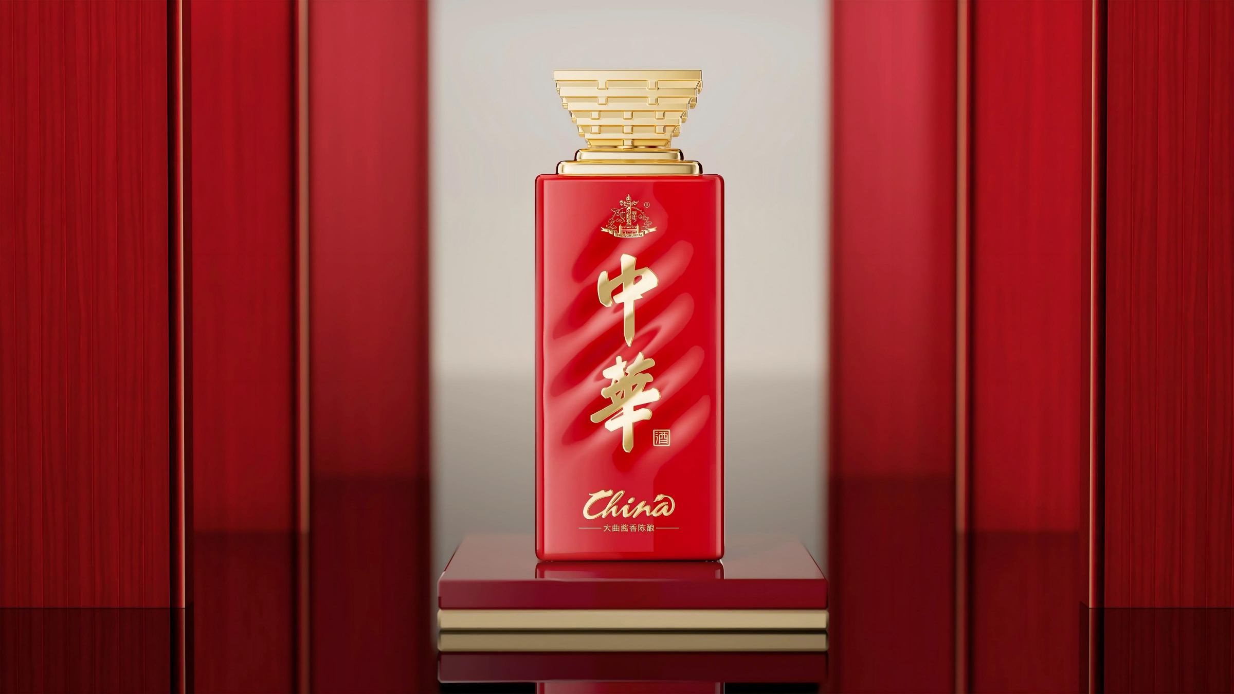 瓶盖以中国建筑的经典构型“斗拱”为顶,以「華」字为设计之核,筑层层金台,寓意盛世华夏鼎盛俱兴。